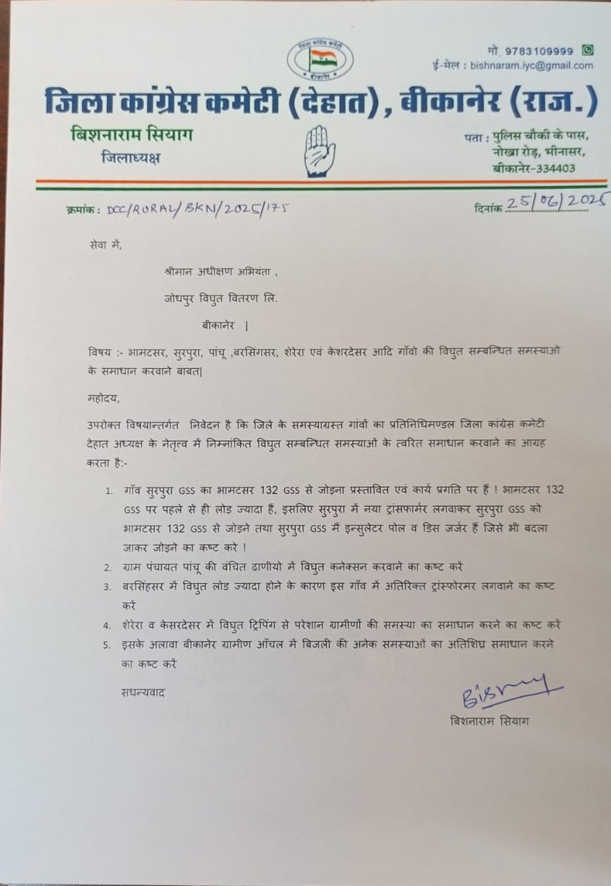 बीकानेर, कांग्रेस कमेटी देहात अध्यक्ष बिशनाराम सियाग के नेतृत्व में सुरपुरा, पांचू, बरसिंहसर, शेरेरा, केसरदेसर के ग्रामीणों सहित कई गांवों के प्रतिनिधिमण्डल ने विभिन्न बिजली सम्बन्धित समस्याओं को लेकर जोधपुर विद्युत वितरण निगम लिमिटेड के अधीक्षण अभियंता को ज्ञापन सौंपकर समस्याओं के समाधान करवाने पर वार्ता की।